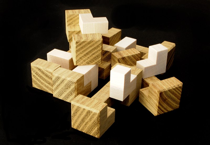 The pieces were designed using the tools that I have programmed in the BurrTools package. I implemented a simple algorithm that starts with basic shapes and tries to add cubes to this shapes in such a way that the resulting puzzle is as complicated as possible.