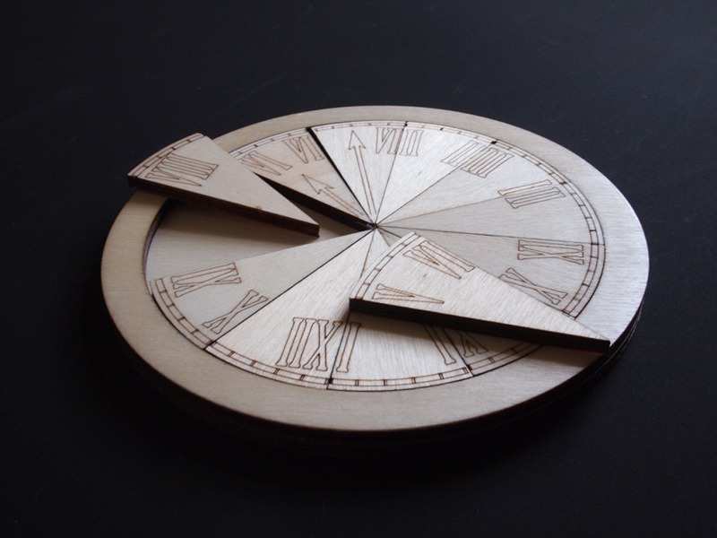The puzzle is made out of laser cut plywood. The cutting has been done by Peter Knoppers. Andreas sanded the pieces to make them look nicely.